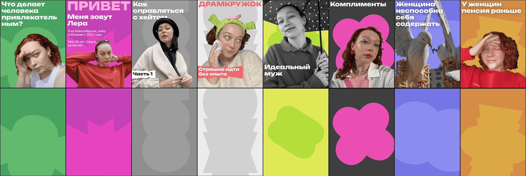 Дизайн для личного Instagram-блога Валерии Кузьминых. Я поддержал яркий образ простой, но эмоциональной графикой: насыщенная палитра, крупная типографика и выразительные формы.